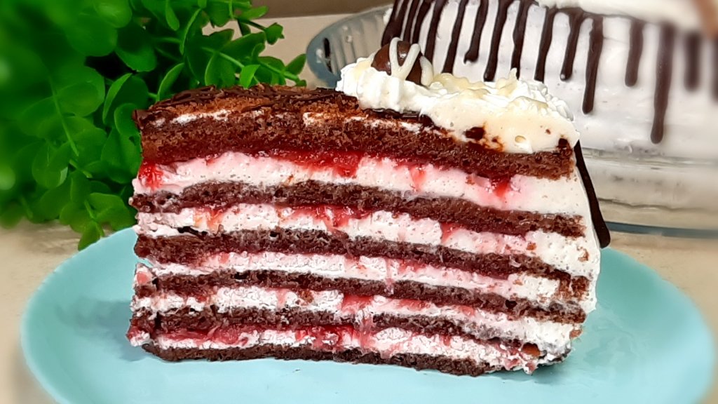 Нежнейший, хорошо пропитанный торт с клубничным конфи и крем чизом можно подавать к столу. Посмотрите, как аппетитно он смотрится в разрезе!