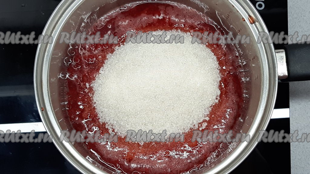 Теперь приступаю к приготовлению клубничного конфи, но ещё лучше, если вы его приготовите самым первым. Для конфи можно использовать и замороженную, и свежую клубнику. Но если вы готовите с замороженной клубникой, тогда немного разморозьте ягоды и слейте лишнюю жидкость. В сотейник выкладываю клубнику, предварительно пробитую блендером до состояния пюре, и всыпаю сахар.