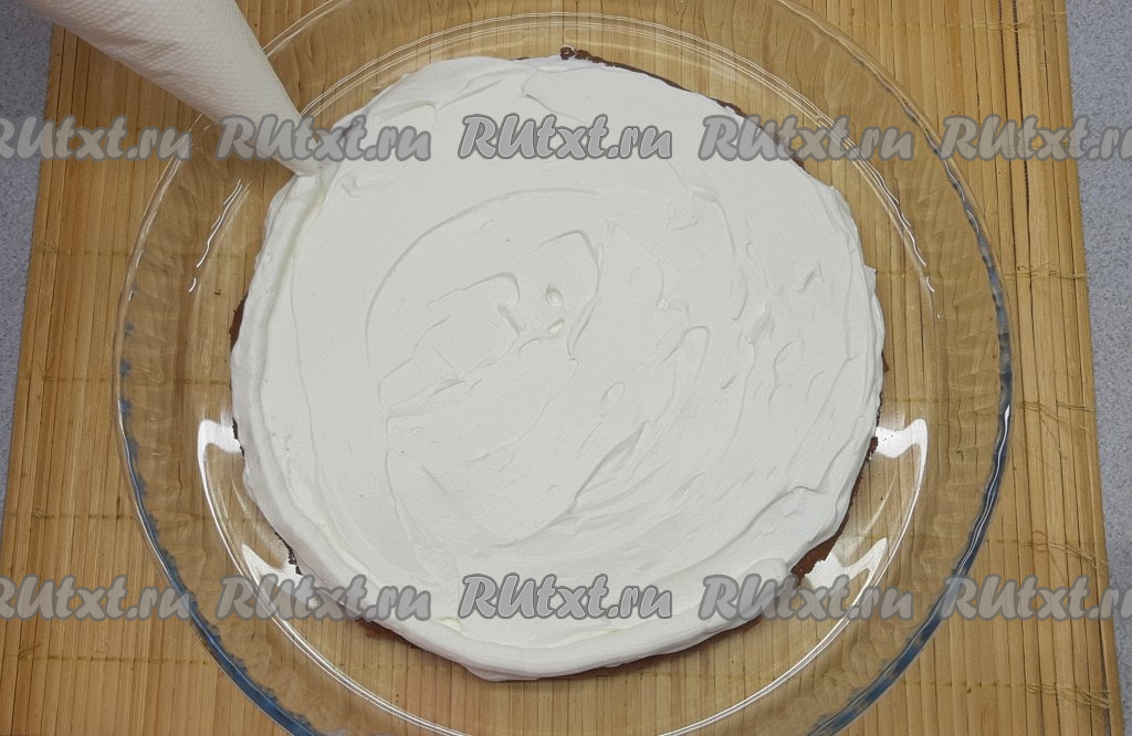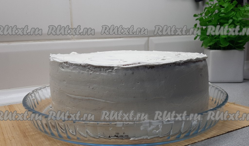 Верхний корж просто смазываю тонким слоем крема, бока торта тоже смазываю кремом. Примерно, 4 столовые ложки крема я оставляю (этот крем потребуются для украшения торта в дальнейшем).