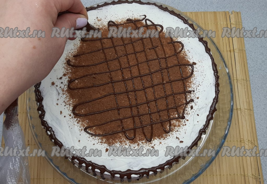Крошкой, отложенной для украшения торта, я присыпаю центр торта, верх покрываю лёгкой сеткой оставшегося растопленного шоколада.