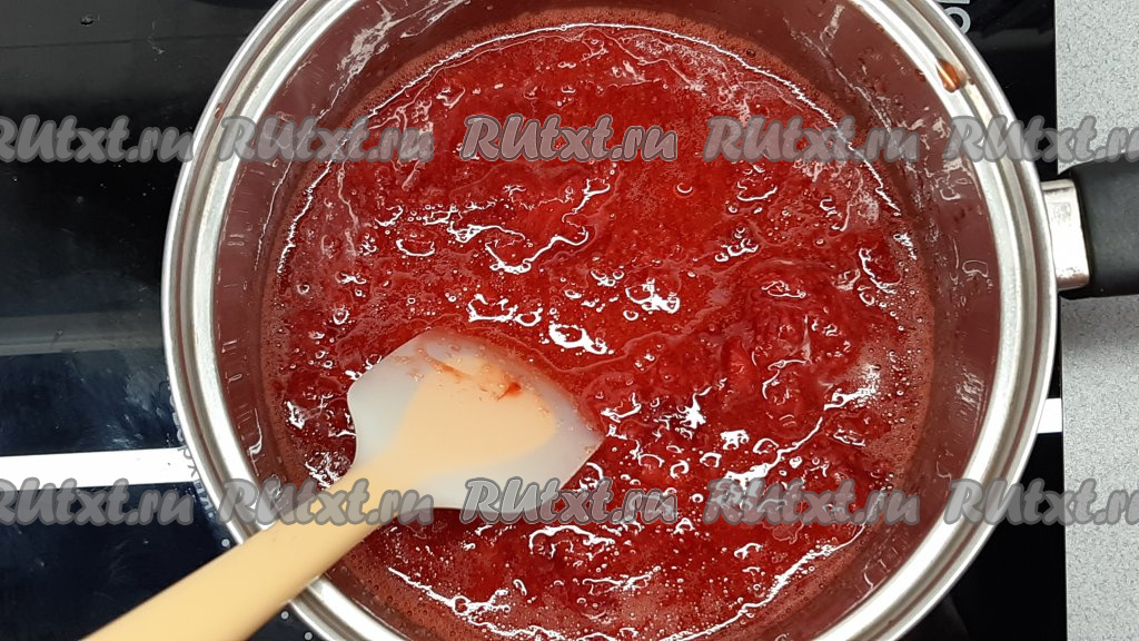 Довожу до кипения, как только появляются первые большие пузырьки, снимаю с огня и, интенсивно перемешивая, всыпаю клубничное желе.