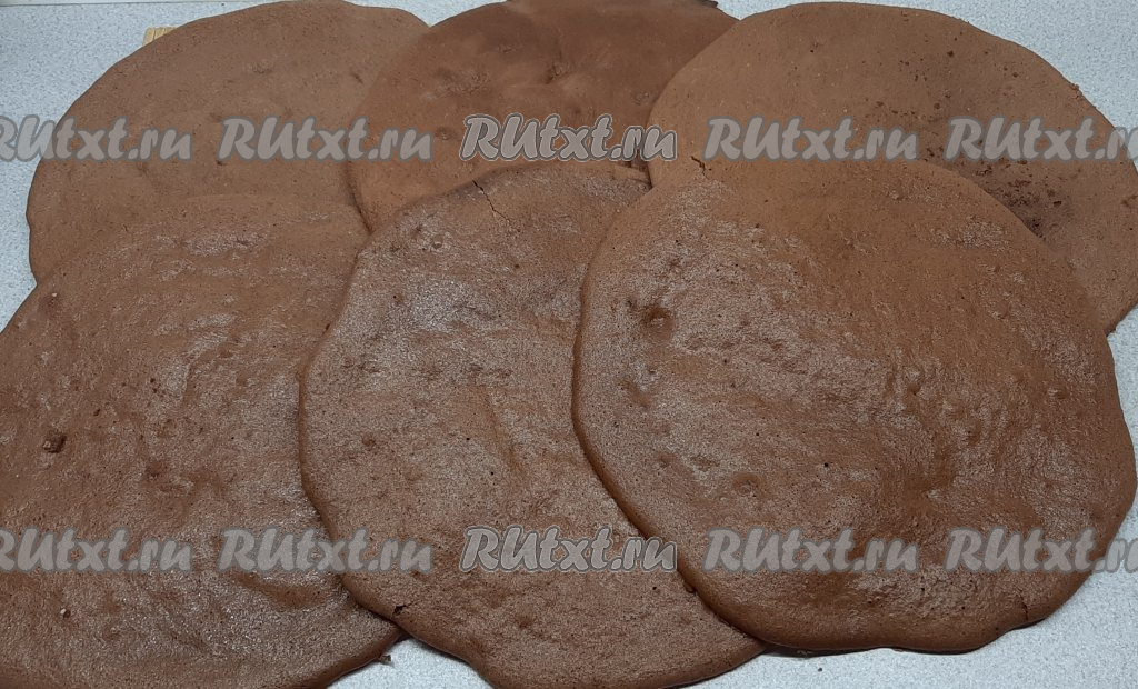 Помещаю два противня с коржами в разогретую до 180 градусов духовку на средний уровень. Выпекаю на режиме "Верхний и нижний нагрев". Через 5 минут меняю противни местами, чтобы коржи равномерно пропеклись, и выпекаю ещё, примерно, 5 минут. Коржи получаются тонкими и очень пористыми, мягкими, не пересушенными. Пока выпекаются первые два коржа, взбиваю следующую порцию теста из 2 яиц, щепотки соли, 70 грамм сахара, смешиваю с 10 граммами какао и 50 граммами муки, выпекаю ещё 2 коржа. Ну и соответственно выпекаю ещё 2 коржа из оставшихся ингредиентов. По желанию, коржи можно немного подровнять (я выкладываю поверх коржей крышку диаметром 25 см и обрезаю края). Обрезков получится совсем немного, их можно подсушить в течение нескольких минут в духовке, а затем раскрошить и в дальнейшем использовать для украшения. Даю 6 испечённым коржам полностью остыть.