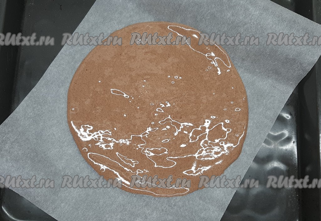 Долго не перемешиваю, только до однородной консистенции и перекладываю половину теста на лист антипригарного пергамента, на котором предварительно нарисовала круг диаметром 25 см. Тонко распределяю тесто, формируя корж до границ нарисованного круга. Тоже самое проделываю на втором листе пергамента со второй половиной теста.
