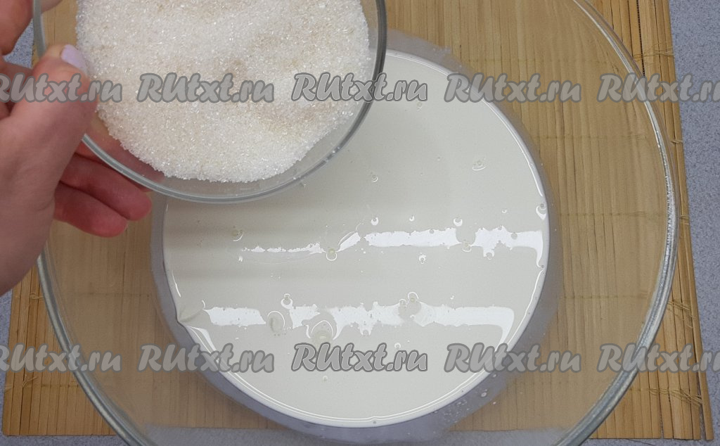 Я сразу не смешиваю все ингредиенты для приготовления бисквита, а делю их на три части. Из каждой такой части выпекаю по два тонких бисквитных коржа. В результате торт будет состоять из 6 коржей. Итак, приступим к приготовлению. Ставлю духовку разогреваться до 180 градусов. Приступаю к приготовлению теста для первых двух коржей, для этого в достаточно глубокой миске соединяю 2 яйца с щепоткой соли, взбиваю миксером до однородности, затем, продолжая взбивать, начинаю постепенно добавлять 70 грамм сахара.