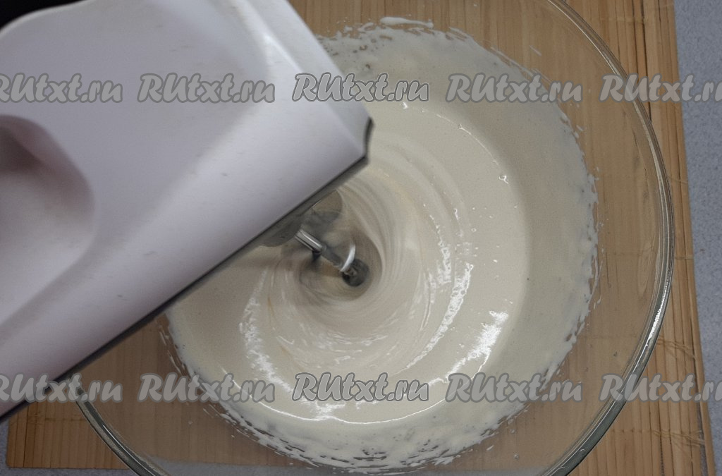 Взбиваю яичную массу до того момента, пока она не станет плотной, воздушной и практически белой, а на поверхности начнут появляться чёткие рисунки от венчиков миксера.