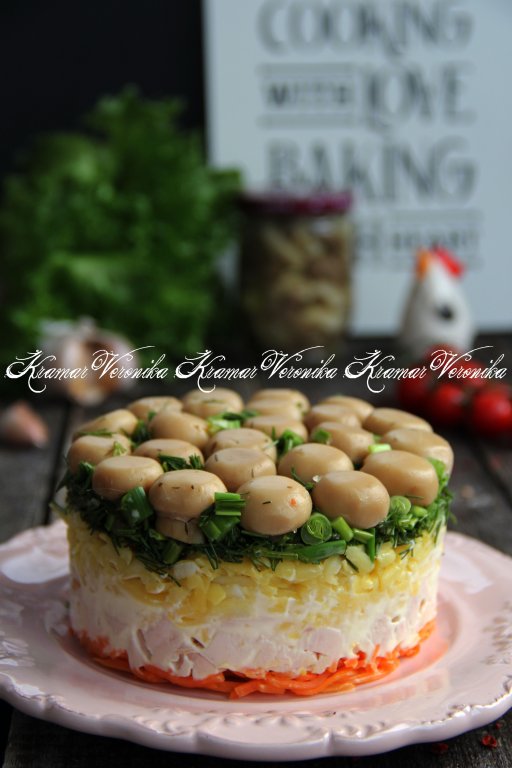 Рецептов салата "Лесная поляна" существует немало. Особенность этого салатика в том, что формируется он слоями, а перед подачей переворачивается. В итоге на столе у вас будет красивый, яркий салат, внешне напоминающий лесную полянку, покрытую грибочками. В этот раз я предлагаю приготовить наивкуснейший салат "Лесная поляна" с копчёной курицей, морковью по-корейски и маринованными шампиньонами. Для этого блюда надо брать небольшие целые грибочки. Маринованные шампиньоны и корейскую морковку можно купить в магазине или приготовить в домашних условиях. В этом салате настолько удачное сочетание ингредиентов, что всем советую его попробовать!