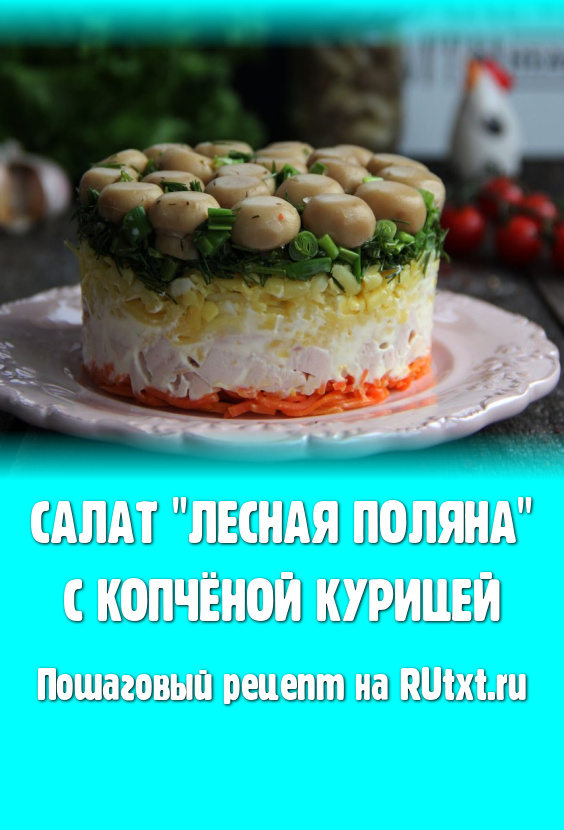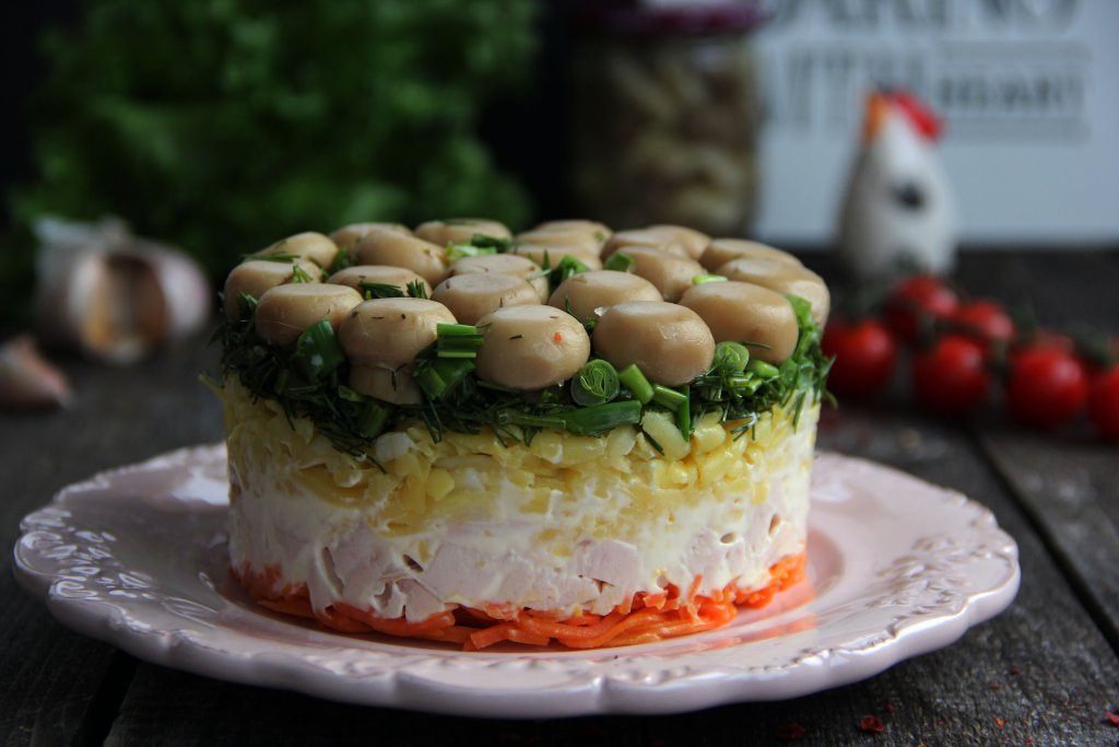 Вкусный, сытный, красивый салат "Лесная поляна", приготовленный с копчёной курицей и маринованными шампиньонами, подать к праздничному столу.