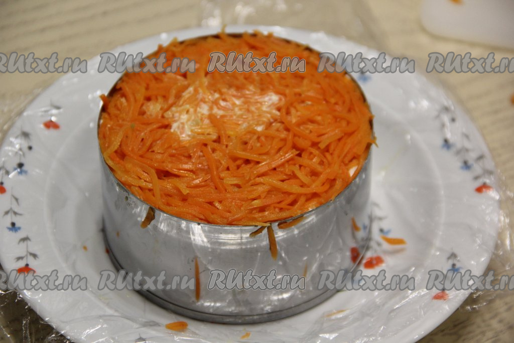 Если морковка по-корейски очень длинная, нарезать её на более короткие полоски и выложить поверх копчёной курицы, немного утрамбовать. Дать салату в течение 2-3 часов пропитаться, поместив тарелку с кольцом в холодильник.