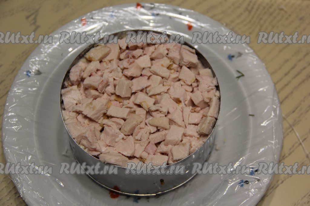 Копчёную курочку нарезать на мелкие кубики и выложить поверх картошки. Я взяла копчёное куриное филе, но можно взять любые части курицы, отделив мясо от костей. Слегка утрамбовать мясо и смазать майонезом.