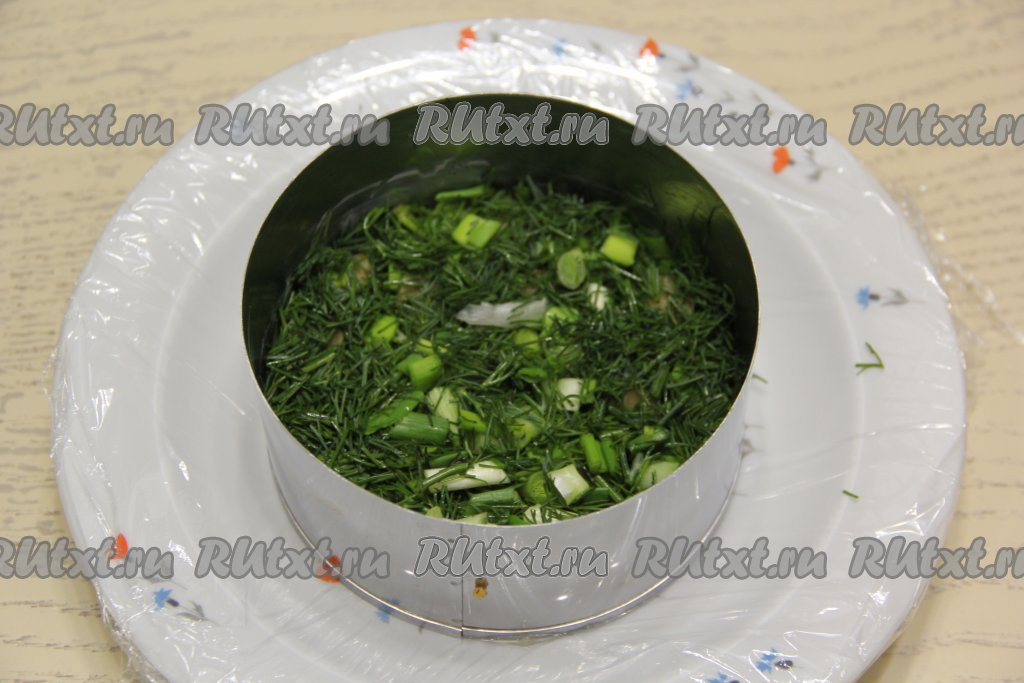 Перед подачей достать тарелку с салатом из холодильника. Концы плёнки прижать к кольцу и аккуратно перевернуть салат на тарелку. Осторожно снять плёнку и убрать бортики кольца.