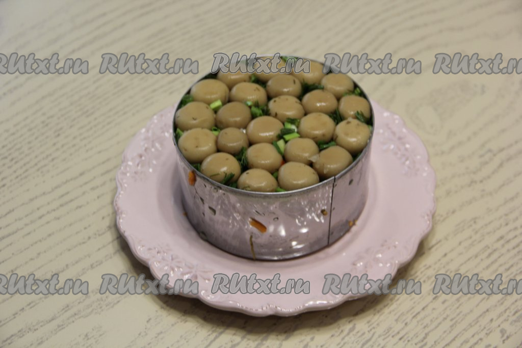 Этот салат формируется слоями. Удобно формировать его в кольце для формирования салатов или в кольце от разъёмной формы для выпечки бисквитов. Я формировала 2 салата в двух кулинарных кольцах диаметром 12 см, поэтому равномерно распределяла ингредиенты по двум кольцам. Итак, плоскую тарелку нужно застелить пищевой плёнкой (плёнка поможет перевернуть этот салат-перевёртыш после его формирования). Первым слоем внутрь кольца выложить целые шампиньоны шляпками вниз.