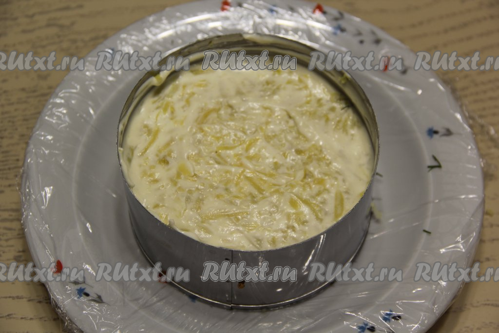 Очистить остывшую варёную картошку, натереть на тёрке, равномерно выложить поверх зелени, слегка утрамбовать, посолить и смазать майонезом.