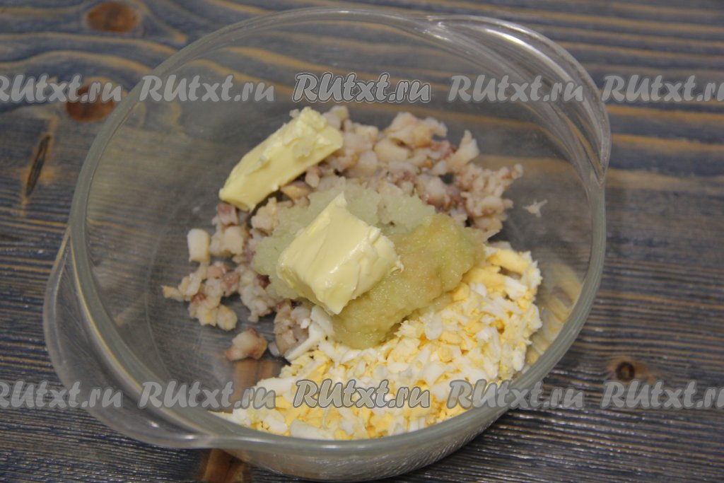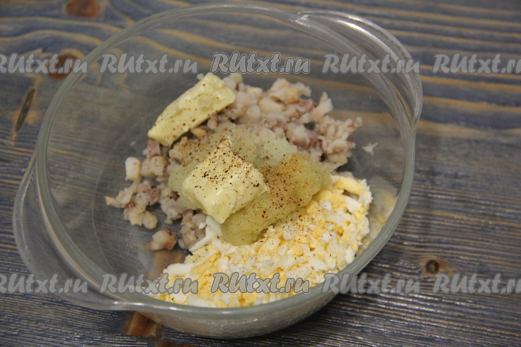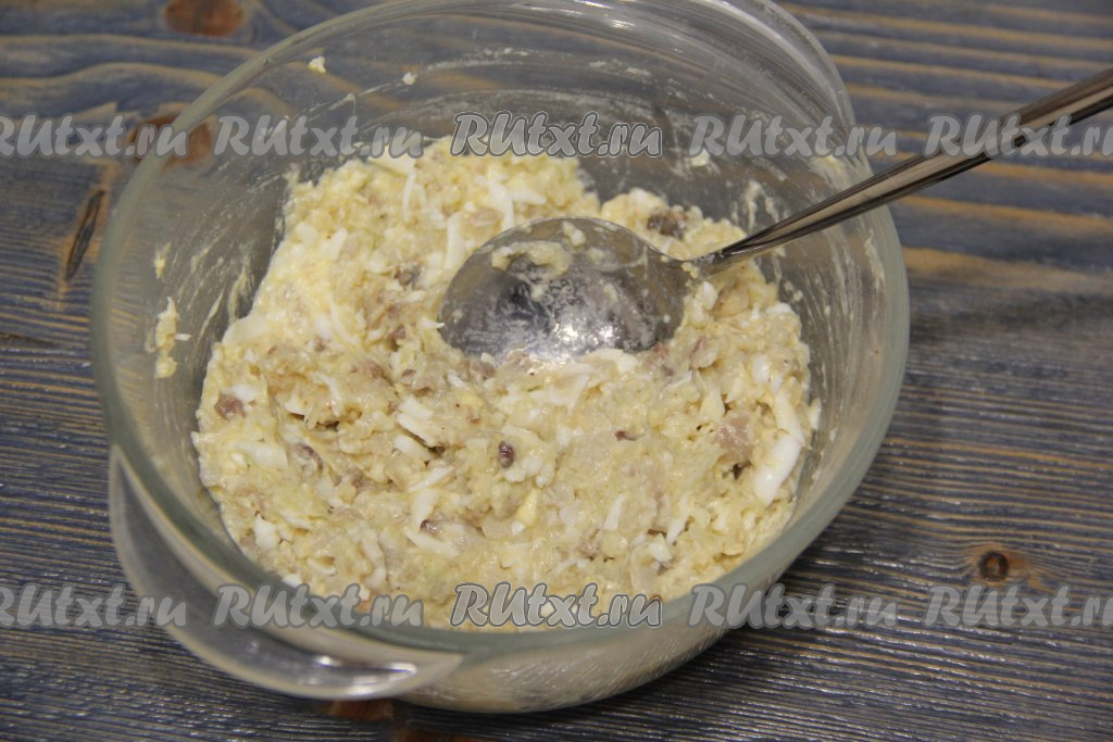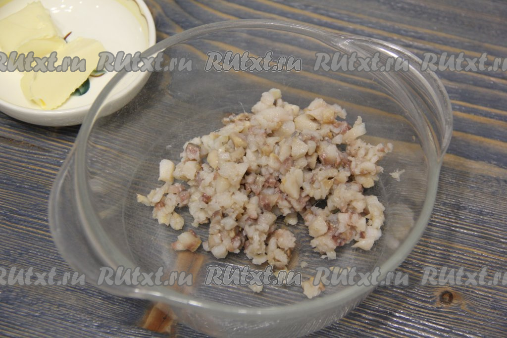 Филе селёдки порубить с помощью ножа на мелкие кусочки, переложить в миску.