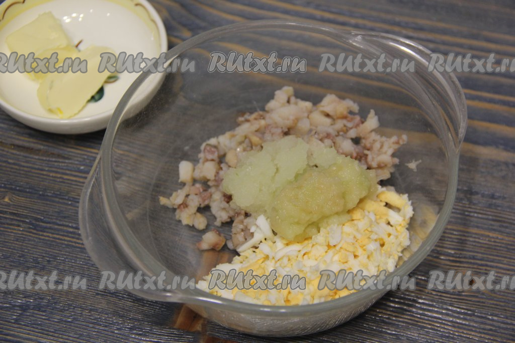 Яблоко очистить от кожуры и натереть на мелкой тёрке. Натереть на мелкой тёрке очищенную половину луковицы. Добавить натёртое яблоко и лук в миску к сельди и яйцу.