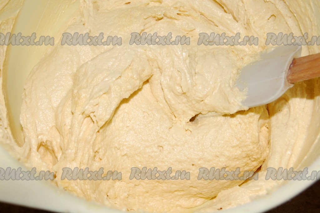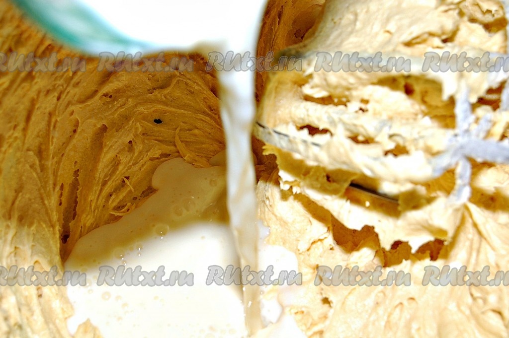 Затем постепенно добавить муку с молоком, по очереди, непрерывно взбивая миксером. Сначала часть муки, затем часть молока, потом ещё часть муки, затем ещё часть молока. И так до тех пор, пока не закончится вся мука и всё молоко.