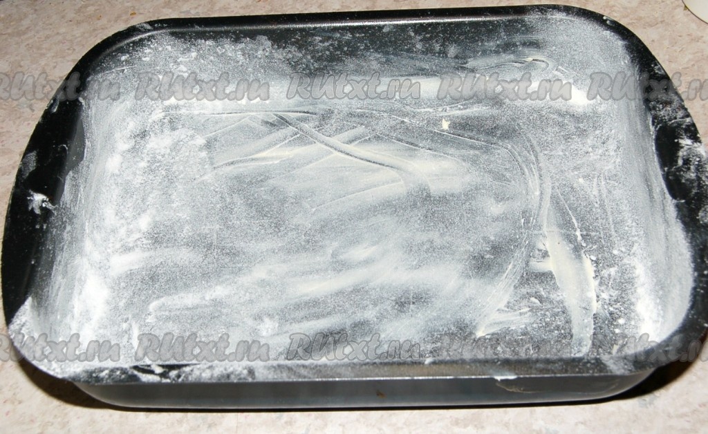 Форму средних размеров смазать сливочным маслом и обсыпать мукой, лишнюю муку стряхнуть.