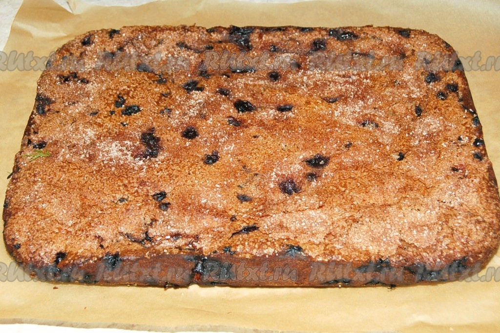 Готовность черничного пирога проверяем, прокалывая его лучинкой. Если лучинка осталась сухой, достаём наш пирог из духовки.