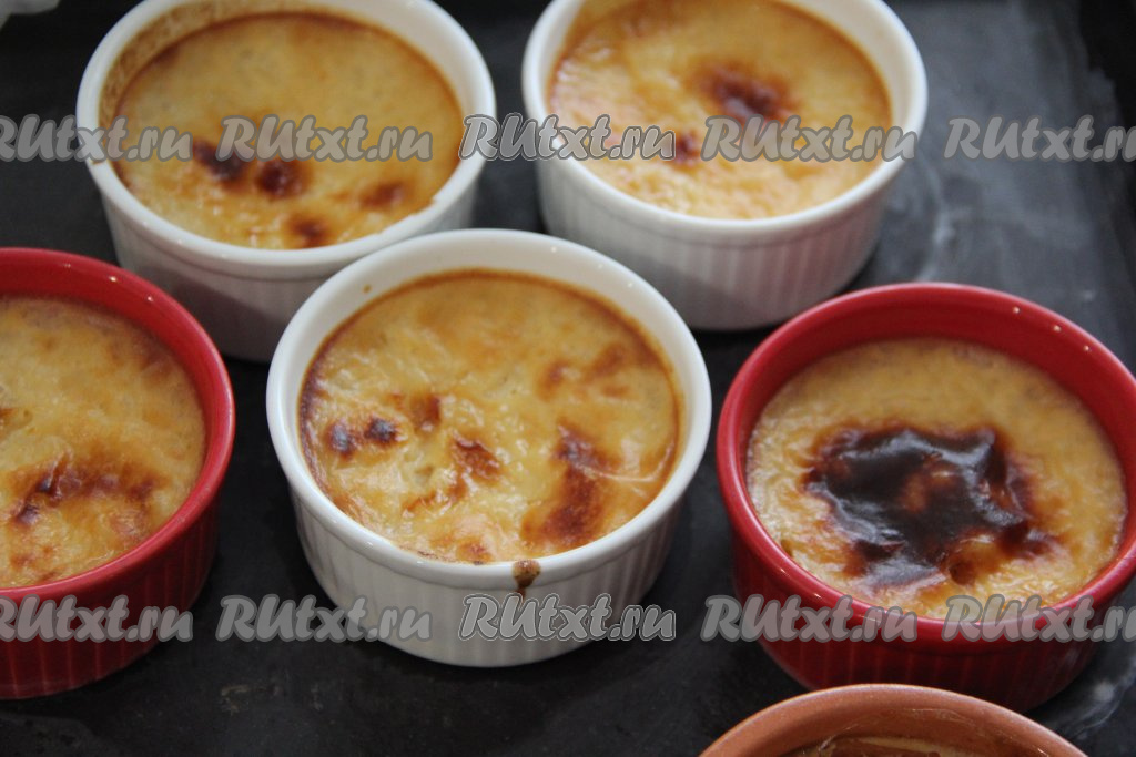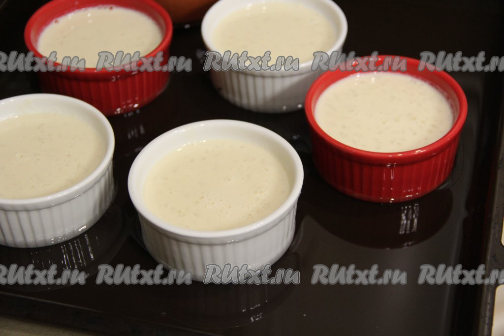 Разложить массу по порционным формочкам (я разлила по 6 формочкам) и поставить на противень. Влить на противень воду, чтобы она покрывала формочки, примерно, на 1 см.
