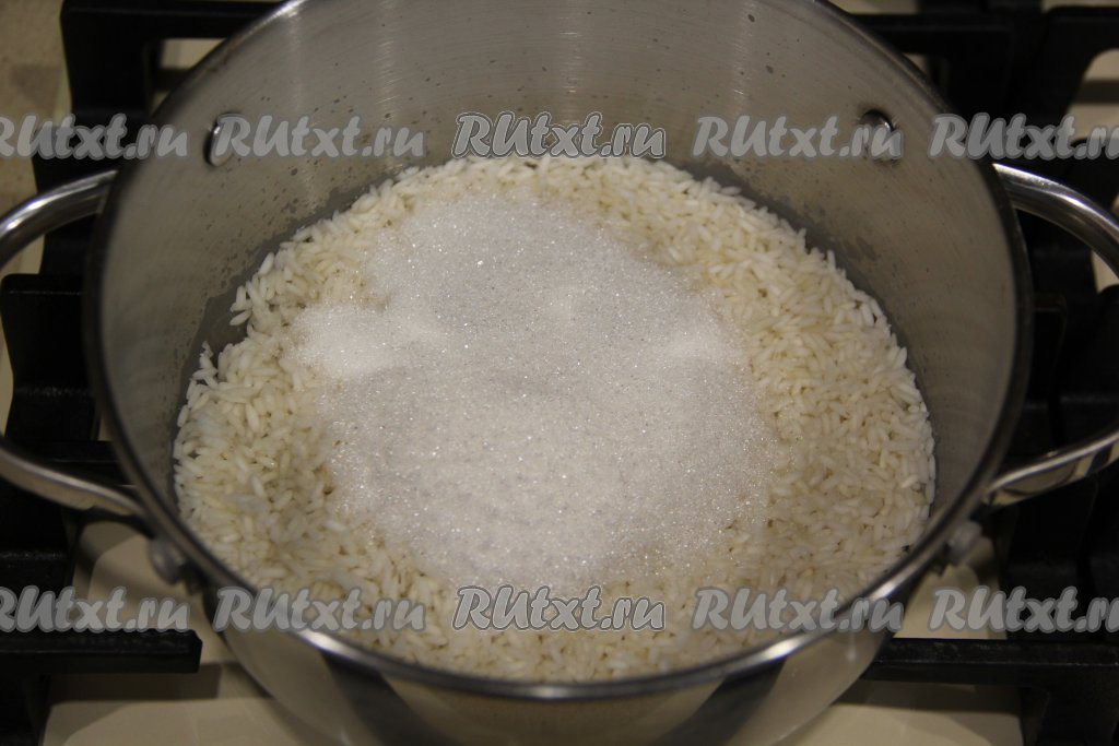 После закипания варить рис на огне чуть ниже среднего до полного испарения воды (примерно, 7-10 минут), затем всыпать сахар.