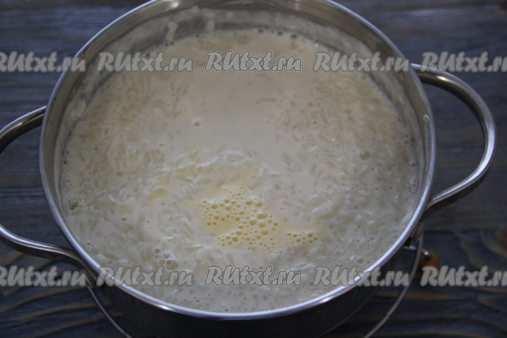 Тонкой струйкой, непрерывно перемешивая венчиком, влить желтковую массу в кастрюлю с рисовой кашей.
