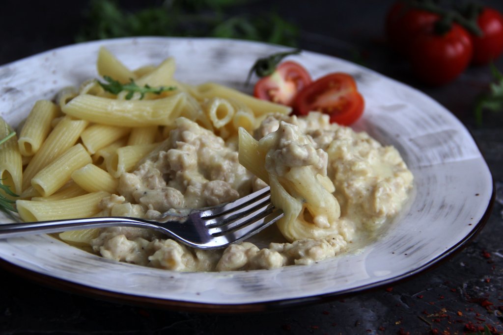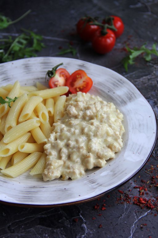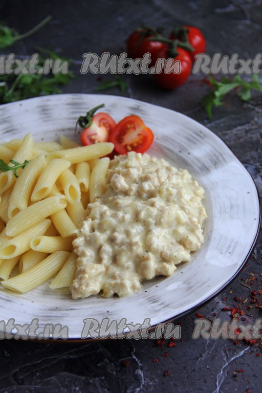 На ужин или к обеду можно приготовить на сковороде наивкуснейший фарш, тушёный с плавленным сыром и сметаной. Блюдо и очень простое, и достаточно быстрое. Фарш можно использовать любой (я взяла куриный фарш). Подать это блюдо можно практически с любым гарниром (я подала с макаронами). Фарш, благодаря соусу, образующемуся в процессе тушения, приобретает приятный сливочный вкус, который, наверняка, понравится и вам, и вашим близким! Всем советую этот рецепт!
