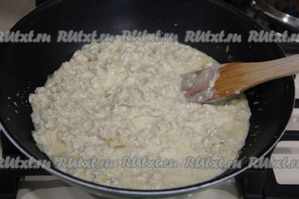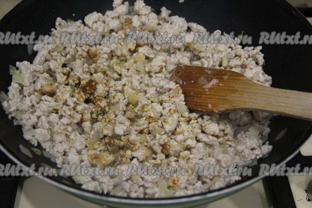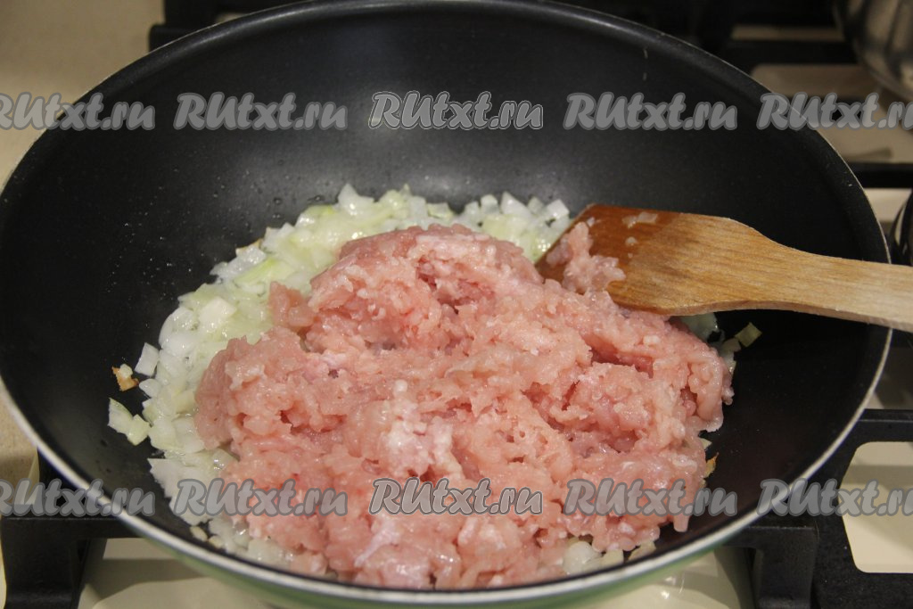 Обжарить фарш с луком, постоянно помешивая и разбивая комочки мяса, минут 10-15 на небольшом огне. Если фарш суховат, в процессе тушения можно добавить несколько столовых ложек воды.