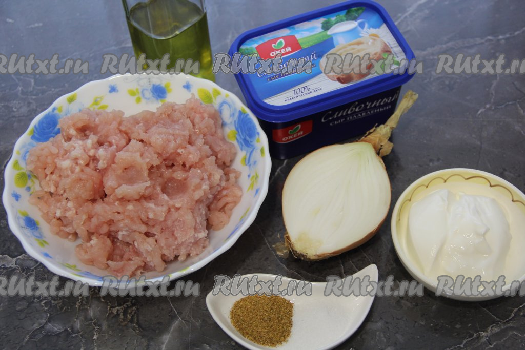 Подготовить продукты. Для этого блюда можно взять покупной фарш. Но я предпочитаю готовить фарш в домашних условиях, пропуская кусочки мяса через мясорубку (я пропустила через мясорубку куриное филе).