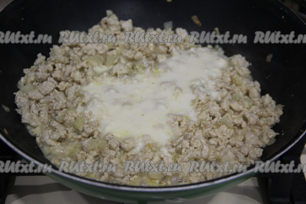Затем на сковороду с фаршем и луком выложить сметану и плавленный сыр.