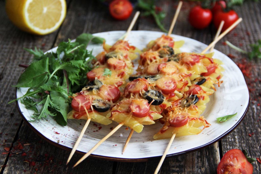 Недавно приготовила в духовке вкусные, аппетитные макароны с сыром на шпажках. Мои дети сказали, что это пицца на шпажке. В роли начинки можно использовать сосиски или любые колбасные изделия, а также, например, оливки. Для этого блюда лучше всего подойдут макароны "перья", их удобно нанизывать на шпажки, они плотно прилегают друг к другу, поэтому поверх них удобно выкладывать начинку. Макаронные изделия для запекания можно взять как свежесваренные, так и оставшиеся после обеда или ужина. Уверена, это простое и сытное блюдо понравится и деткам, и взрослым!
