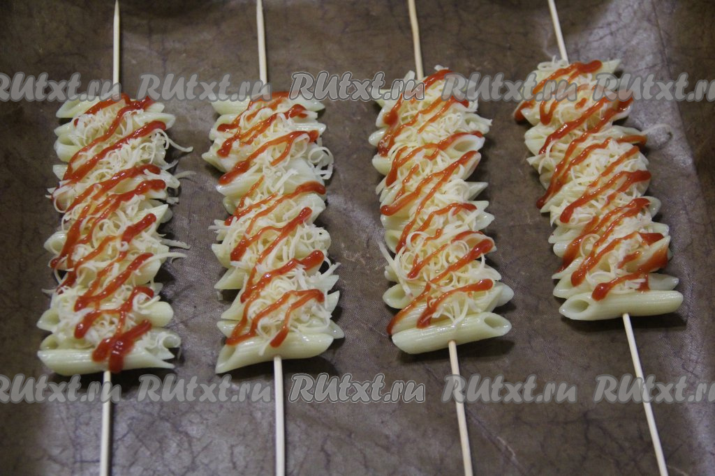 Противень застелить тефлоновым ковриком (или пергаментной бумагой), затем выложить макароны на шпажках.