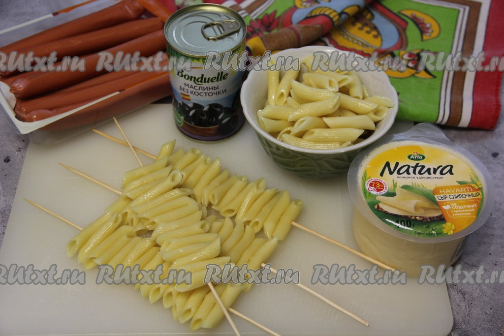 Подготовить продукты. Макароны выложить в кастрюлю с кипящей подсоленной водой и сварить до готовности (обычно на отваривание макаронных изделий требуется минут 7-9, точное время варки указано на упаковке макарон). Важно не переварить макароны, они должны хорошо держать форму после варки. Отваренные макароны сразу откинуть на дуршлаг, чтобы стекла вода, промыть их холодной водой и оставить, чтобы ушла лишняя вода. Для этого блюда можно использовать и макароны, оставшиеся с ужина. Насадить макароны на шпажки. Я на каждую шпажку нанизывала по 15-16 макаронинок. Всего у меня получилось 6 шпажек с макаронами.