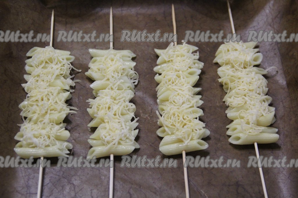 Присыпать шпажки с макаронами оставшимся натёртым сыром.