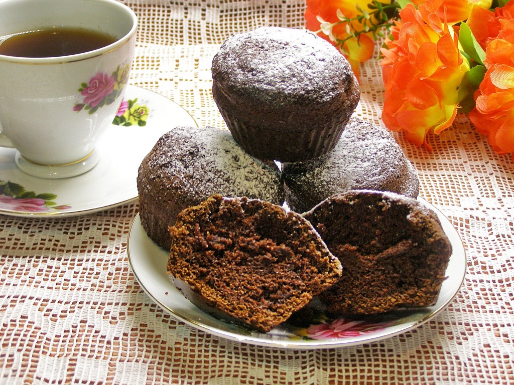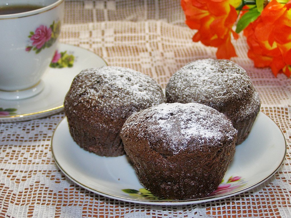 Пока шоколадные маффины не остыли полностью, их можно посыпать сахарной пудрой или украсить по своему вкусу. Подаём маффины к столу с чаем, кофе, горячим шоколадом или какао. Испеките маффины, замешанные на кефире с добавлением какао по этому рецепту, и, я уверена, любителям шоколадной выпечки они точно понравятся!