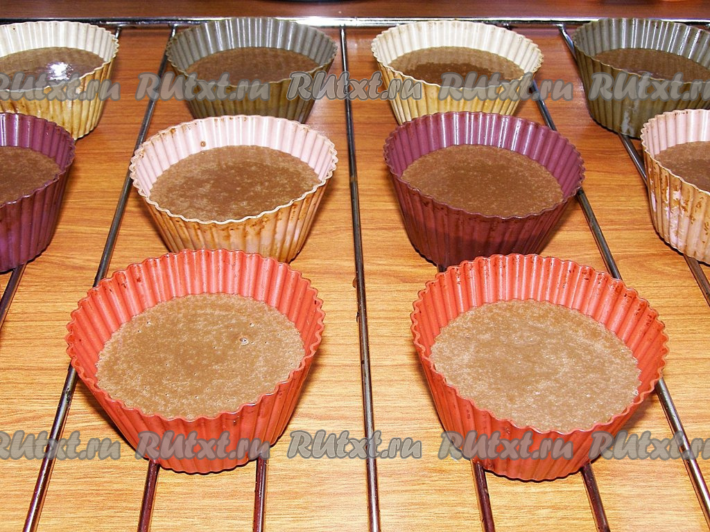 Я запекала маффины в специальных силиконовых формочках и не смазывала их маслом. Если будете готовить в железных формочках, то обязательно смажьте их маслом. Силиконовые формочки ставим на решётку. Вливаем в формочки шоколадное тесто, заполняя формочки, примерно, на 2/3 объёма. У меня получилось 12 формочек с тестом. Советую не заполнять формочки до верха, так как во время выпекания тесто будет подниматься и может вытечь. Ставим решётку с формочками в заранее прогретую до 180 градусов духовку и выпекаем шоколадные маффины, примерно, 30 минут.