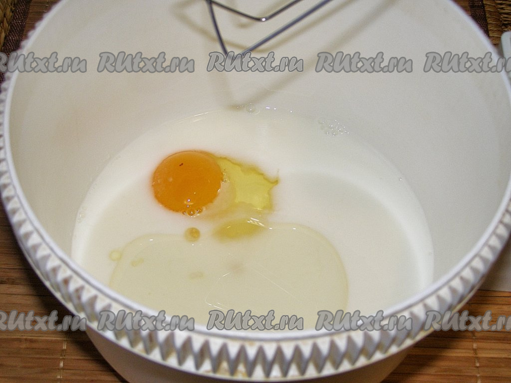 В чашу миксера вливаем кефир, добавляем яйцо и подсолнечное масло без запаха, взбиваем миксером. Долго на этом этапе взбивать не нужно, просто взбиваем до однородности.