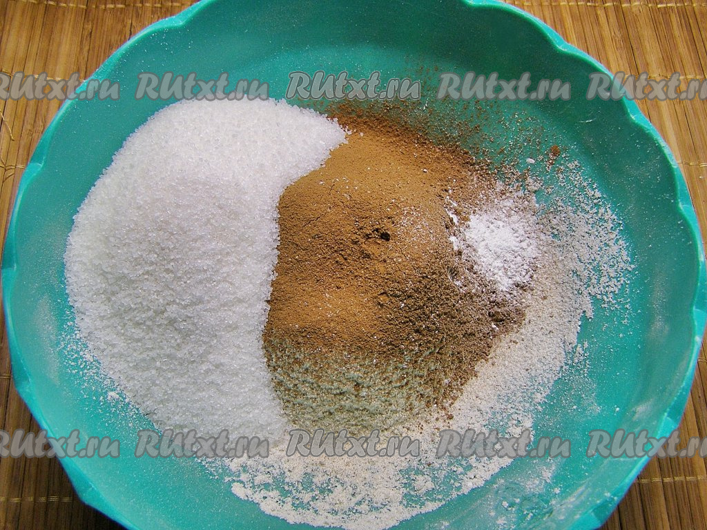 В достаточно объёмную миску просеиваем через сито муку и какао-порошок, затем всыпаем сахар и разрыхлитель, по желанию, можно добавить щепотку ванилина или чайную ложку молотой корицы, перемешиваем ложкой. Смесь сухих ингредиентов должна получиться однородной.