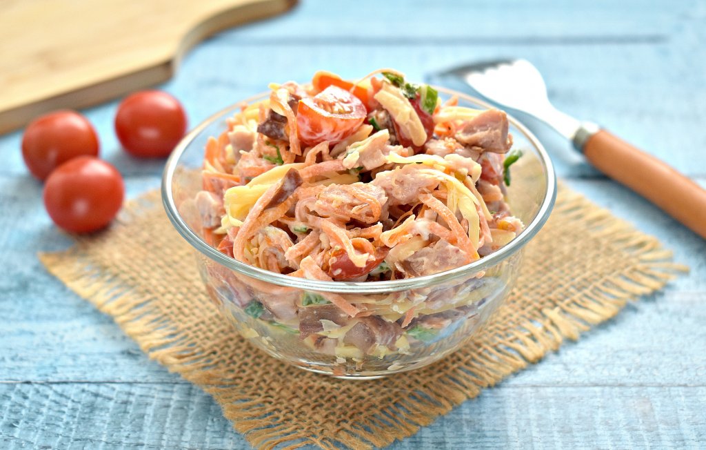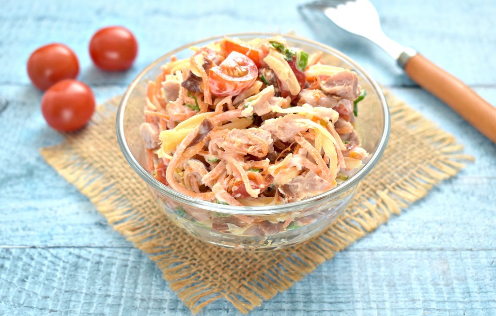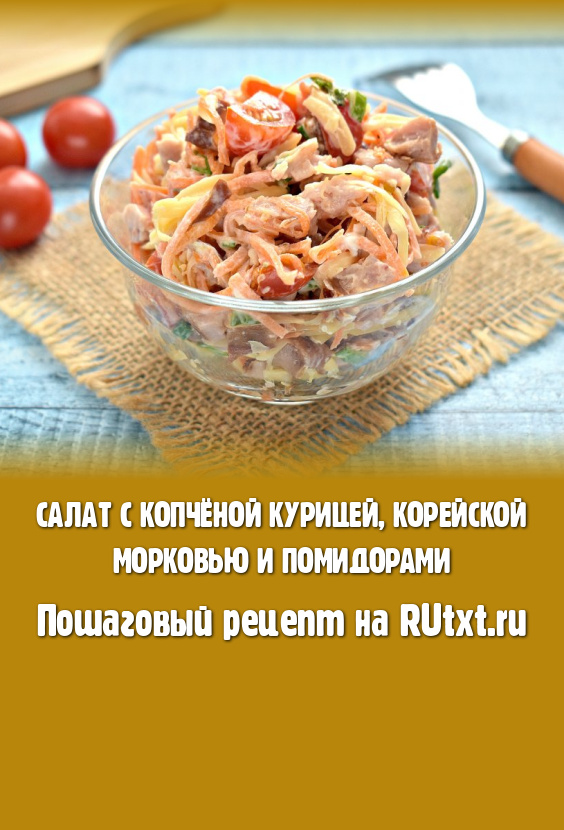 Выбирая салаты для праздничного застолья, нам важно, чтобы они были вкусными, яркими. Ну и, конечно, хочется, чтобы на их приготовление не пришлось тратить много времени. Сегодня хочу поделиться рецептом салата, в состав которого входит копчёная курица, корейская морковь, помидоры и сыр. Готовится это блюдо достаточно быстро, ведь для этого салатика ничего не нужно варить, запекать или жарить. Салат получается ярким, пикантным и очень вкусным. Специи в этом блюде я не использовала, их вполне достаточно в корейской морковке.