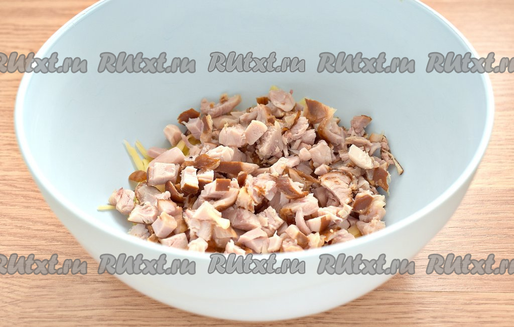 Сюда же выкладываем нарезанное на маленькие кусочки копчёное куриное мясо.