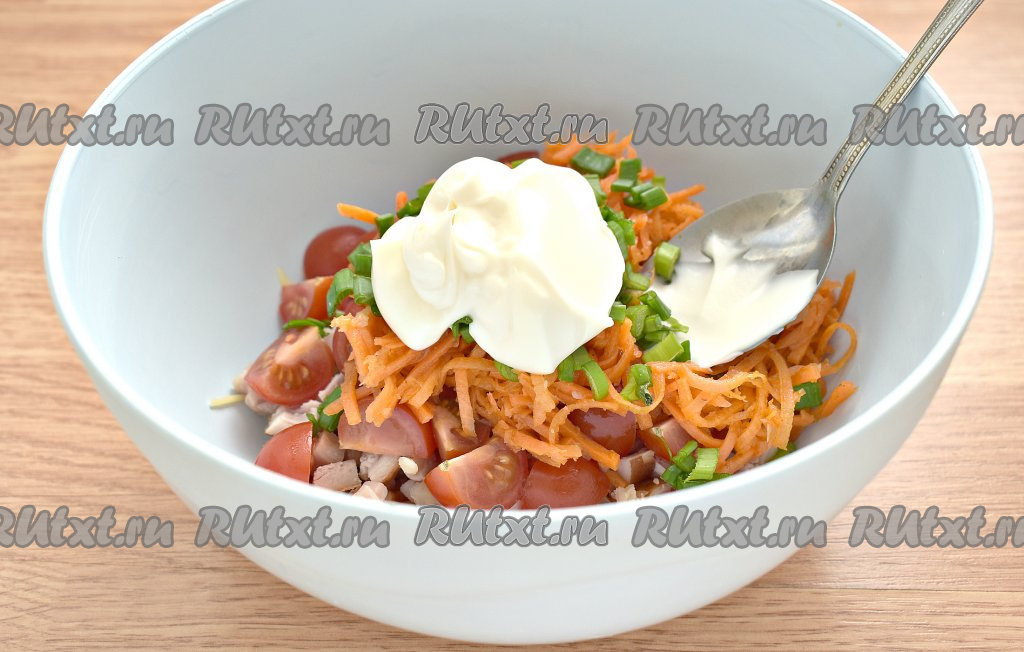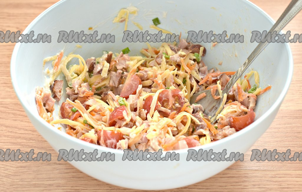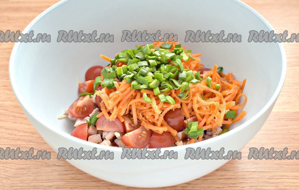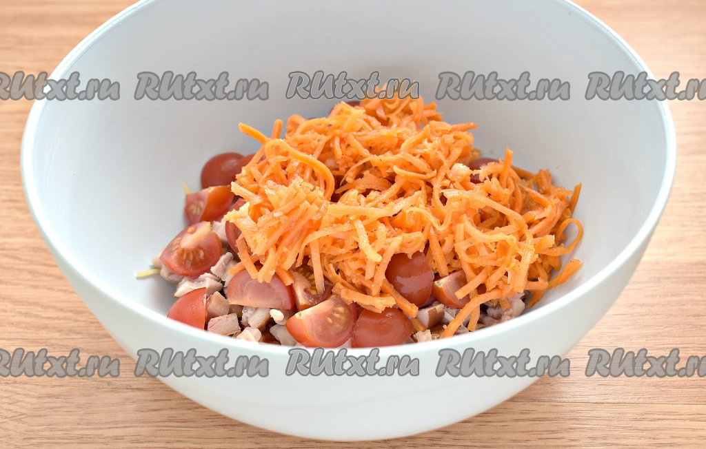 Морковку по-корейски отжимаем от маринада. Очень длинные полоски можно разрезать на 2-3 части. Добавляем корейскую морковь в салат из помидоров, копчёной курицы и сыра.