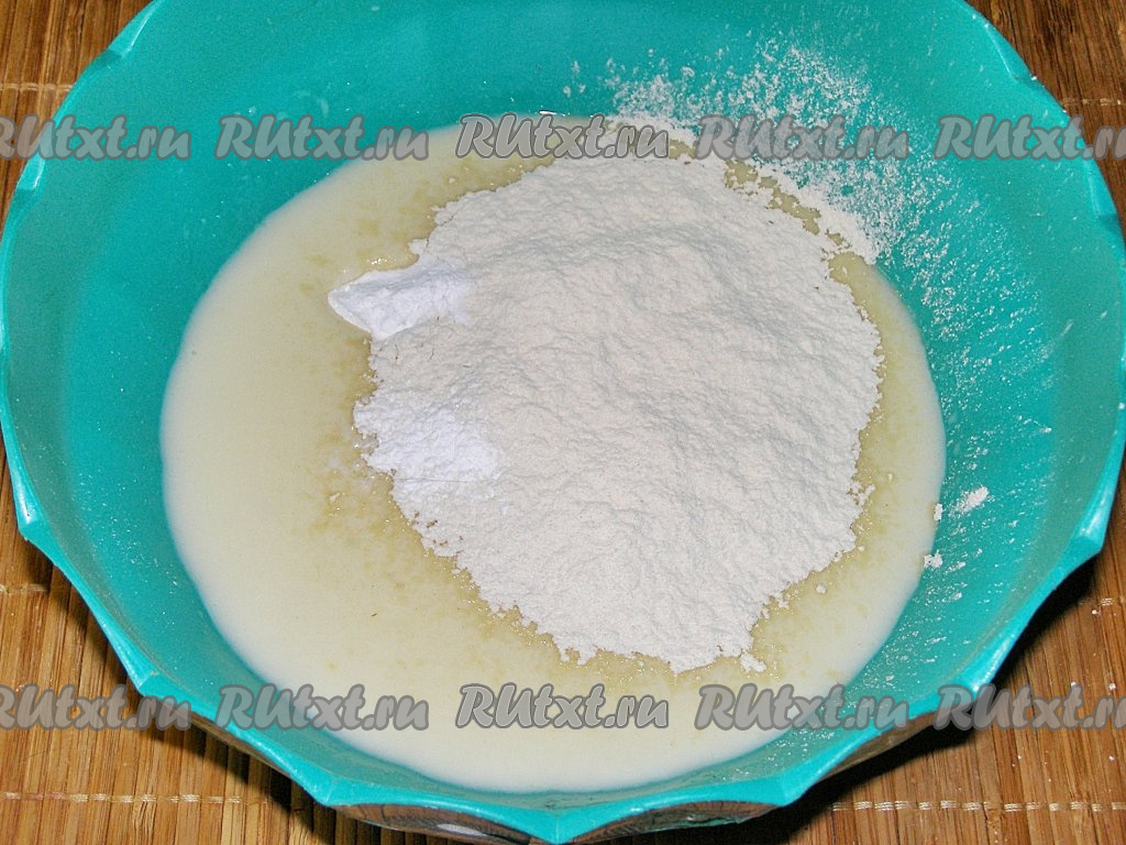 В получившуюся смесь всыпаем часть просеянной муки, добавляем разрыхлитель и соду. По желанию, можно добавить одну щепотку ванилина. Очень хорошо перемешиваем тесто венчиком.