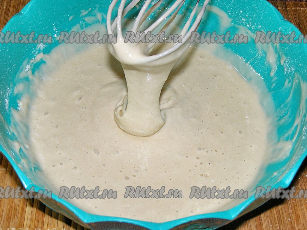 Ориентируясь на консистенцию теста для оладий, постепенно всыпаем оставшуюся просеянную муку, каждый раз хорошо вмешивая её в тесто. Должно получиться достаточно густое тесто, оно будет медленно стекать с венчика. Если тесто получается жидким, можно добавить ещё немного муки. Оставляем тесто при комнатной температуре минут на 15-20.