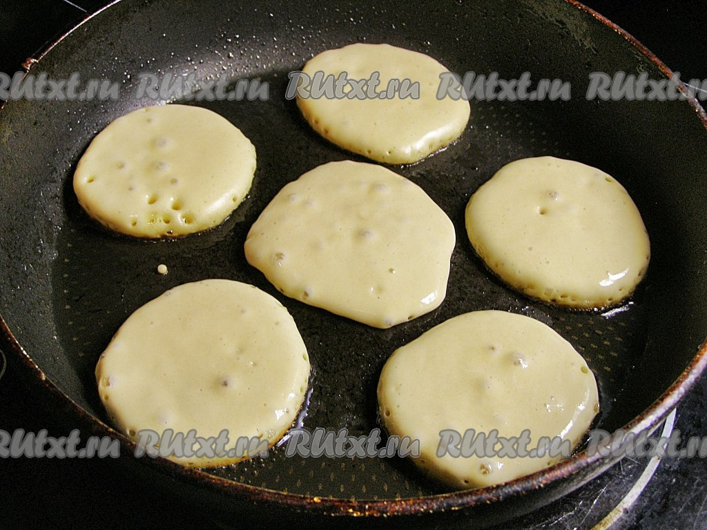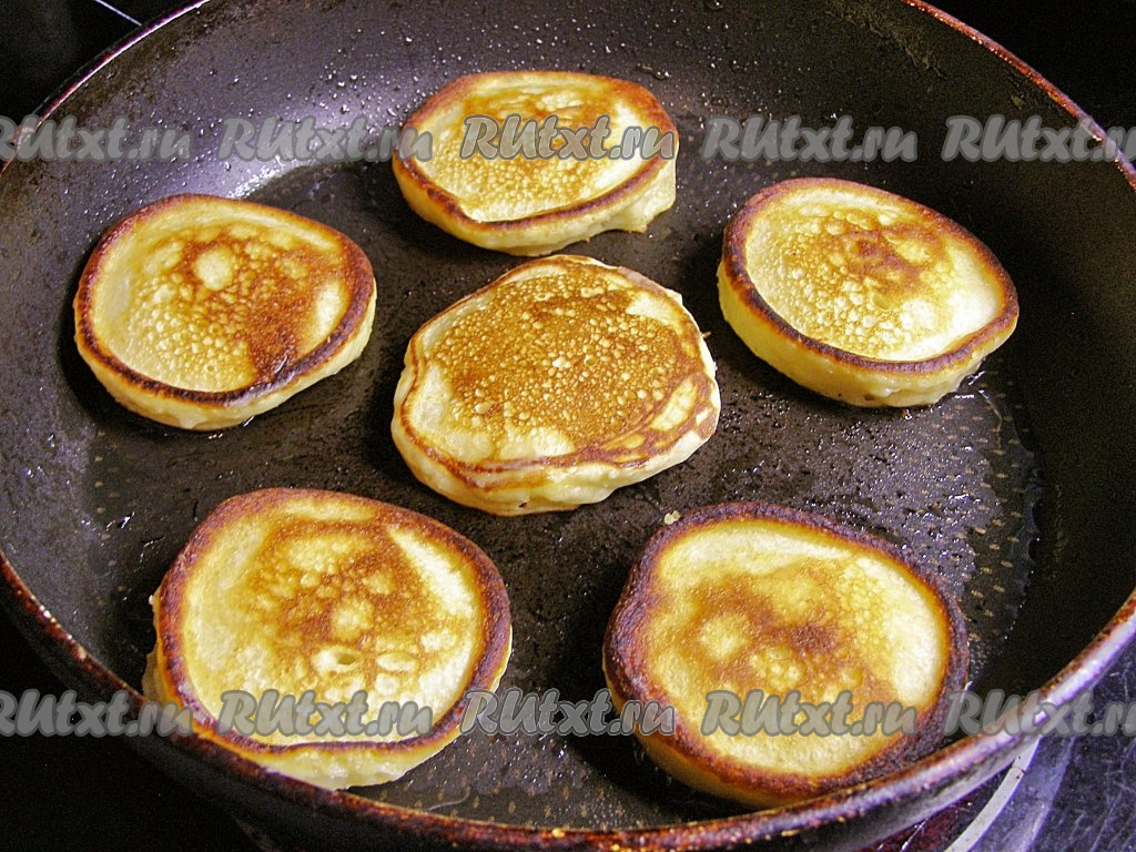 Переворачиваем оладьи лопаточкой и жарим ещё около двух минут с другой стороны, затем перекладываем на тарелку. Перед тем как налить очередную порцию теста, добавляем в сковородку немного масла и разогреваем его. Постепенно готовим все оладушки.