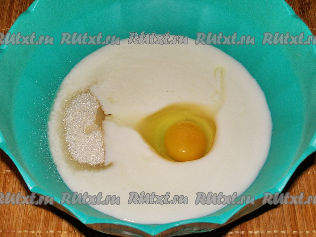 Яйцо и сметану желательно заранее достать из холодильника, чтобы они стали комнатной температуры. В глубокую миску выкладываем сметану, добавляем в неё сахар, яйцо и соль, перемешиваем венчиком, чтобы масса получилась однородной.