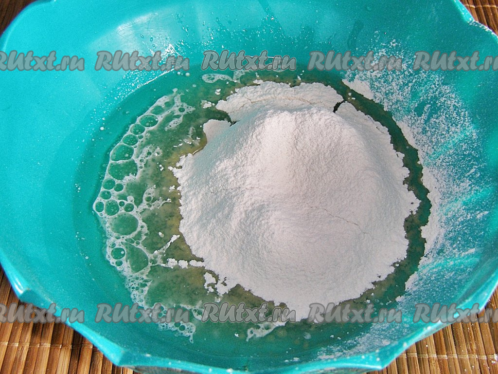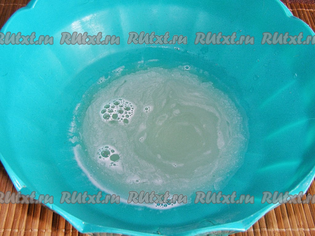 Сыворотку немного подогреваем (примерно, до 40 градусов), выливаем в достаточно глубокую миску, добавляем в неё соду и перемешиваем ложкой (или венчиком). Сыворотка будет немного пениться.