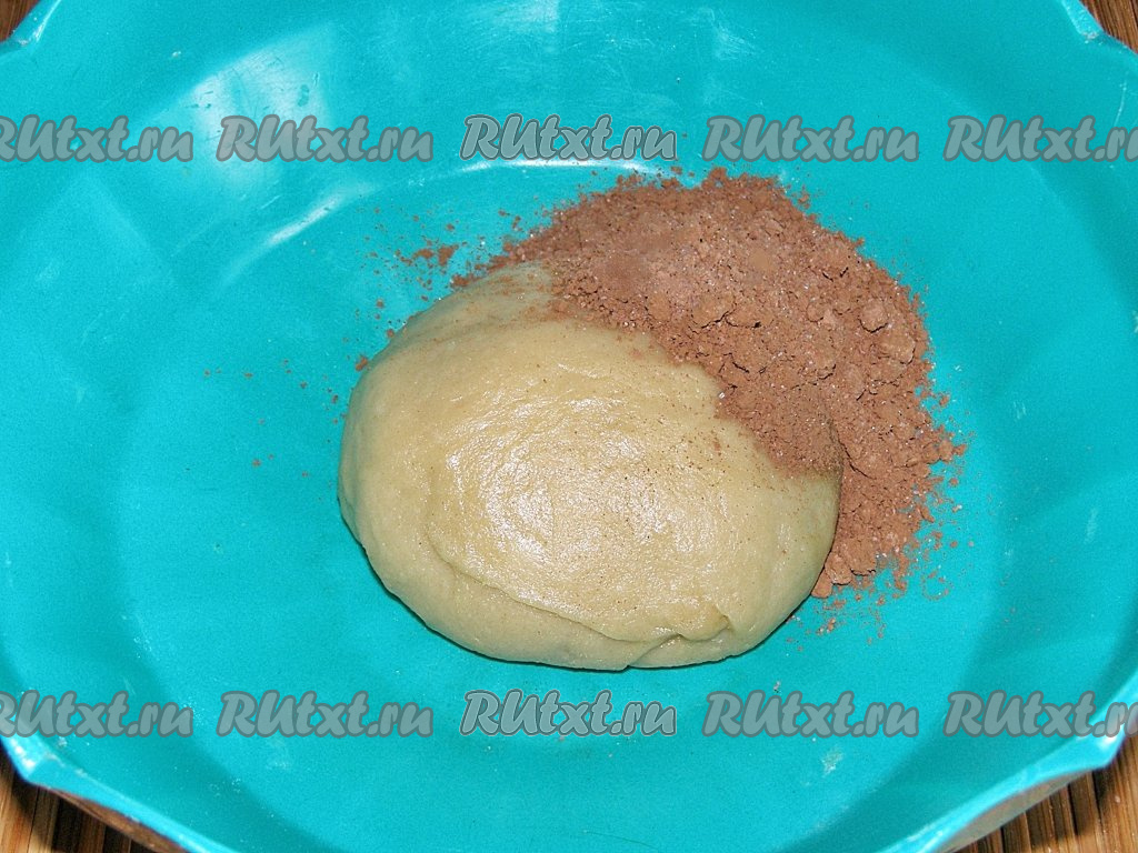 Вмешиваем какао в тесто до получения однородной консистенции и ровного цвета.