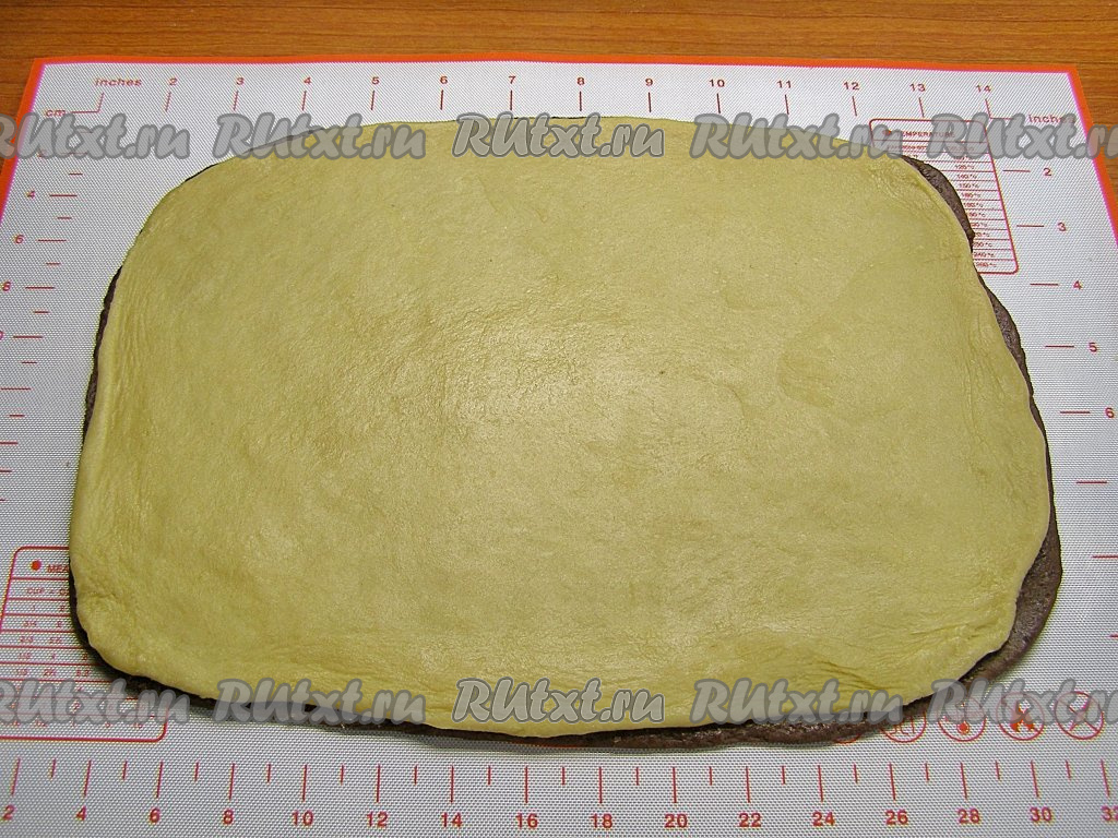 Также тонко в пласт такого же размера раскатываем светлое тесто. Кладём его сверху на шоколадное тесто.