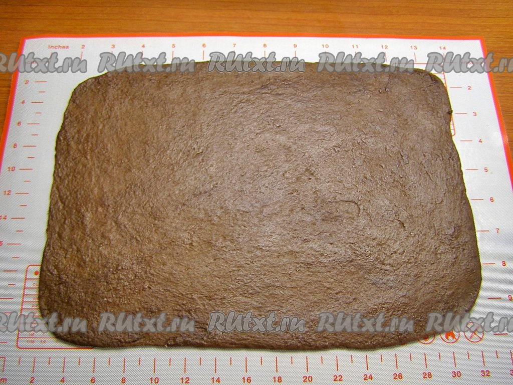 Шоколадное тесто на слегка присыпанной мукой поверхности раскатываем в прямоугольник размером, примерно, 22 сантиметра на 28 сантиметров и толщиной около 3 миллиметров.