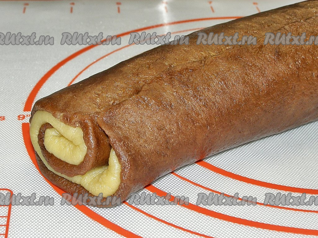 Два пласта теста, сложенные один на другой, скатываем в достаточно плотный рулет, начиная с широкой стороны, и закрепляем край.