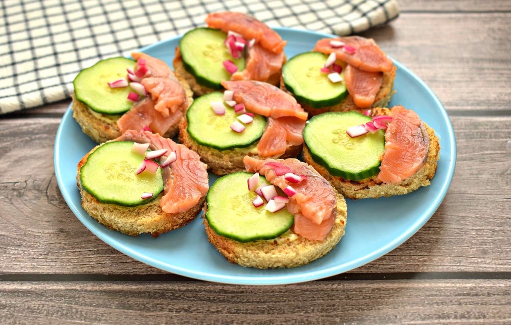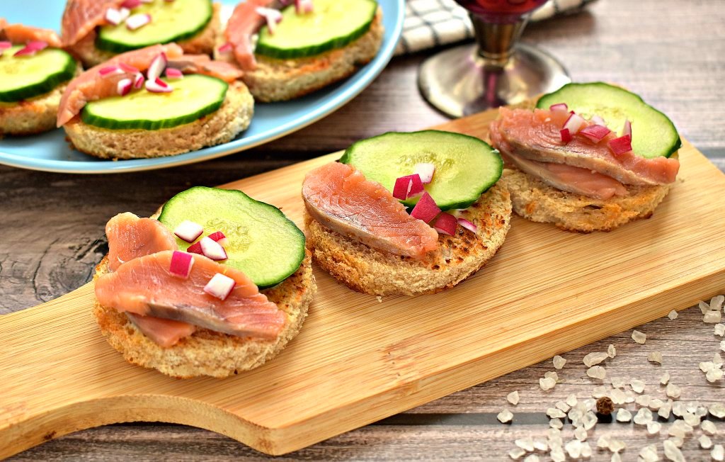 Вкусное канапе с рыбой и свежим огурцом подаём сразу к столу.