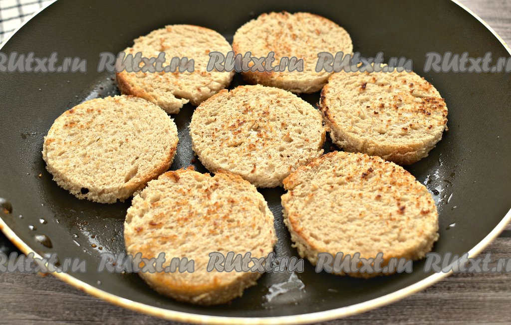 На сковороде разогреваем немного растительного масла. На огне выше среднего поджариваем хлебные заготовки с двух сторон до подрумянивания (примерно, по 1 минуте с каждой стороны).